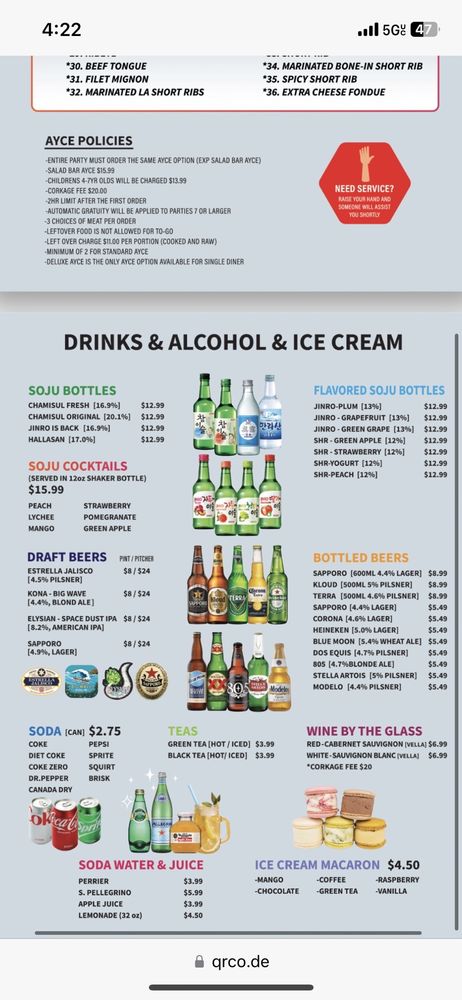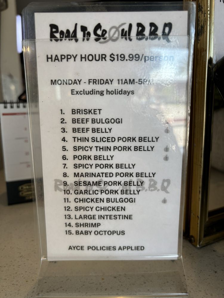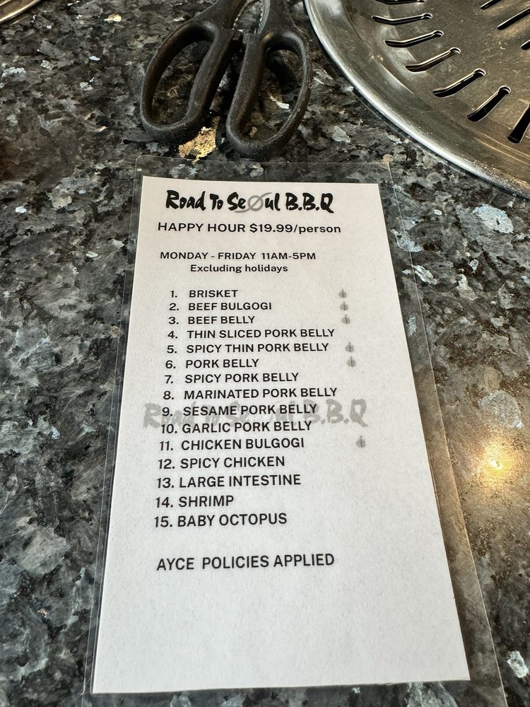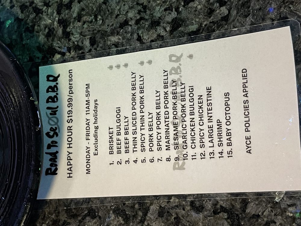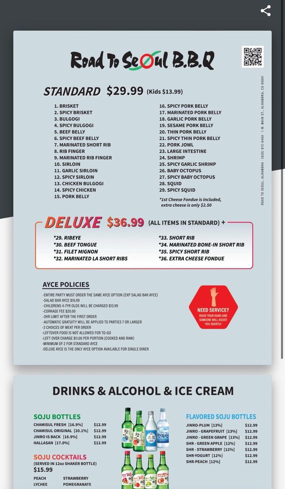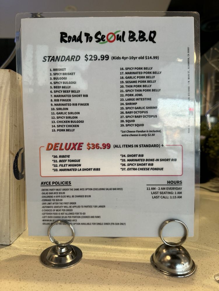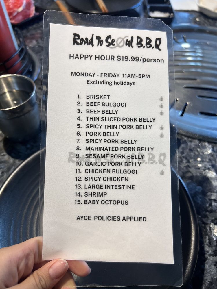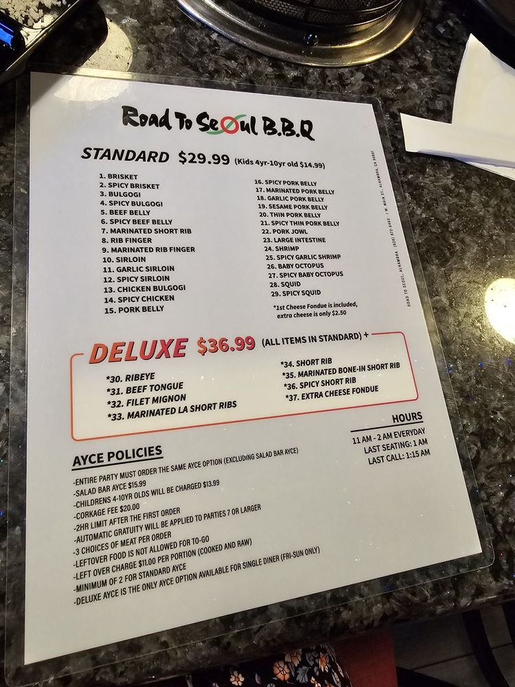 Introducing the menu at Road to Seoul, a trendy and casual Korean BBQ spot in Alhambra, CA. This Asian-owned restaurant offers an all-you-can-eat menu at a reasonable price of $29.99, with many vegetarian options available. The quality of the meat is top-notch, with flavorful choices like brisket, marinated short rib, bulgogi, and beef belly. The buffet-style sides complement the meats perfectly, and service is quick and efficient. Customers rave about the fresh meat selection and the great value during happy hour. The ambience is inviting, with covered outdoor seating and private dining options. Overall, Road to Seoul is a must-visit for anyone craving authentic Korean BBQ in a welcoming atmosphere.